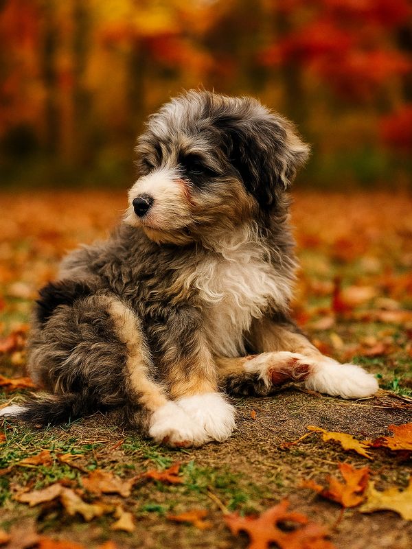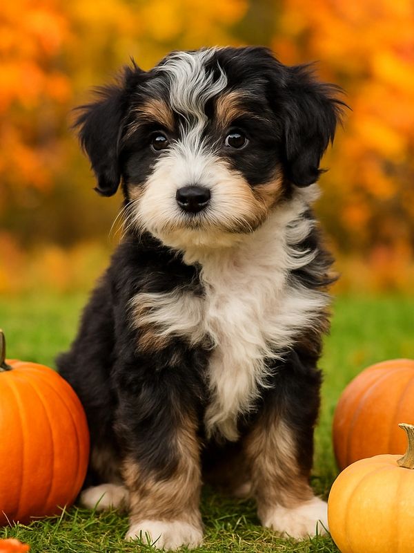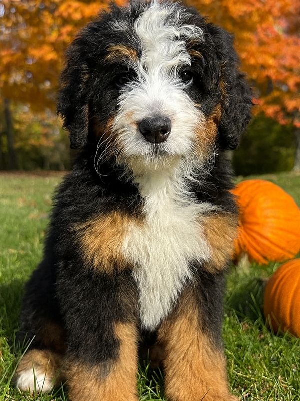 Introducing Tripp... A rare multi-generational Mini Bernedoodle, he qualifies as a micro breed, weighing under 15lbs when fully grown. Tripp is playful, energetic, and entertaining, with a fondness for puzzles, toys, and cuddle time. He makes an excellent "small dog" choice for families or busy households. Additionally, he thrives in a calmer environment that still provides opportunities for play and mental stimulation. His classic tri-color markings are a unique feature, uncommon in the multi-gen Bernedoodle world, and he is a hypoallergenic, non-shedding puppy. If you're looking for looks, lively energy, and a dog eager to please, Tripp is the one for you! He gets along well with other dogs, pets, cats, and children.