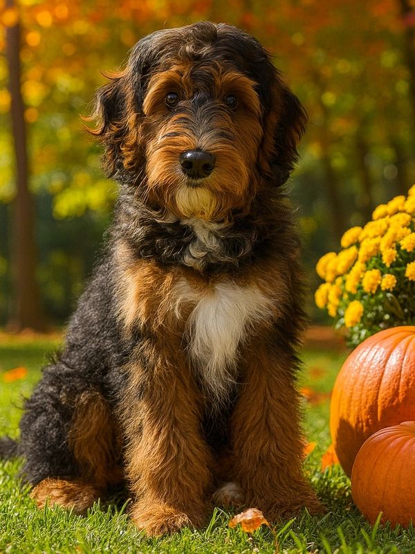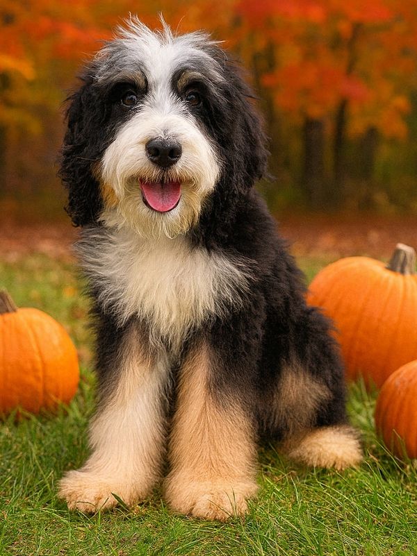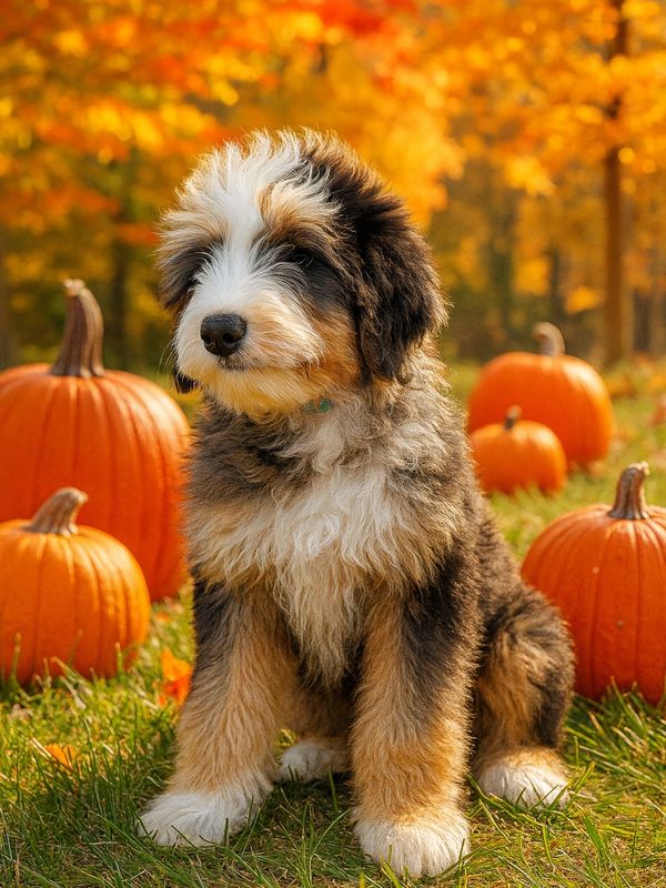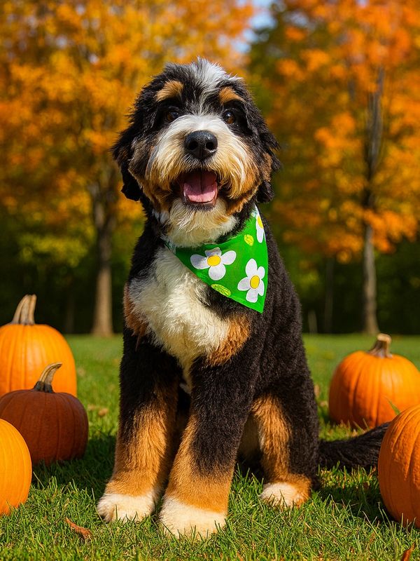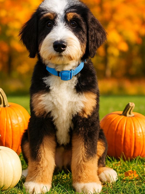 Meet Weston, a stunning, gorgeous, and unique tri-color F1B Bernedoodle. He boasts a fully furnished coat and a stocky build, weighing around 20-30 pounds, which places him in the medium size range. His wavy coat features that classic look we all adore.